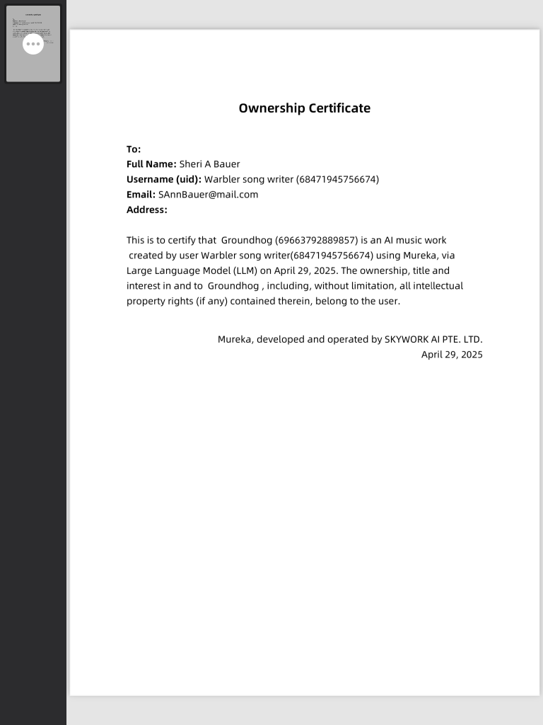 This page was created to show proof of ownership by the author and writer of AI music either by time stamp or Merika certificate of songs made for development of Warbler.